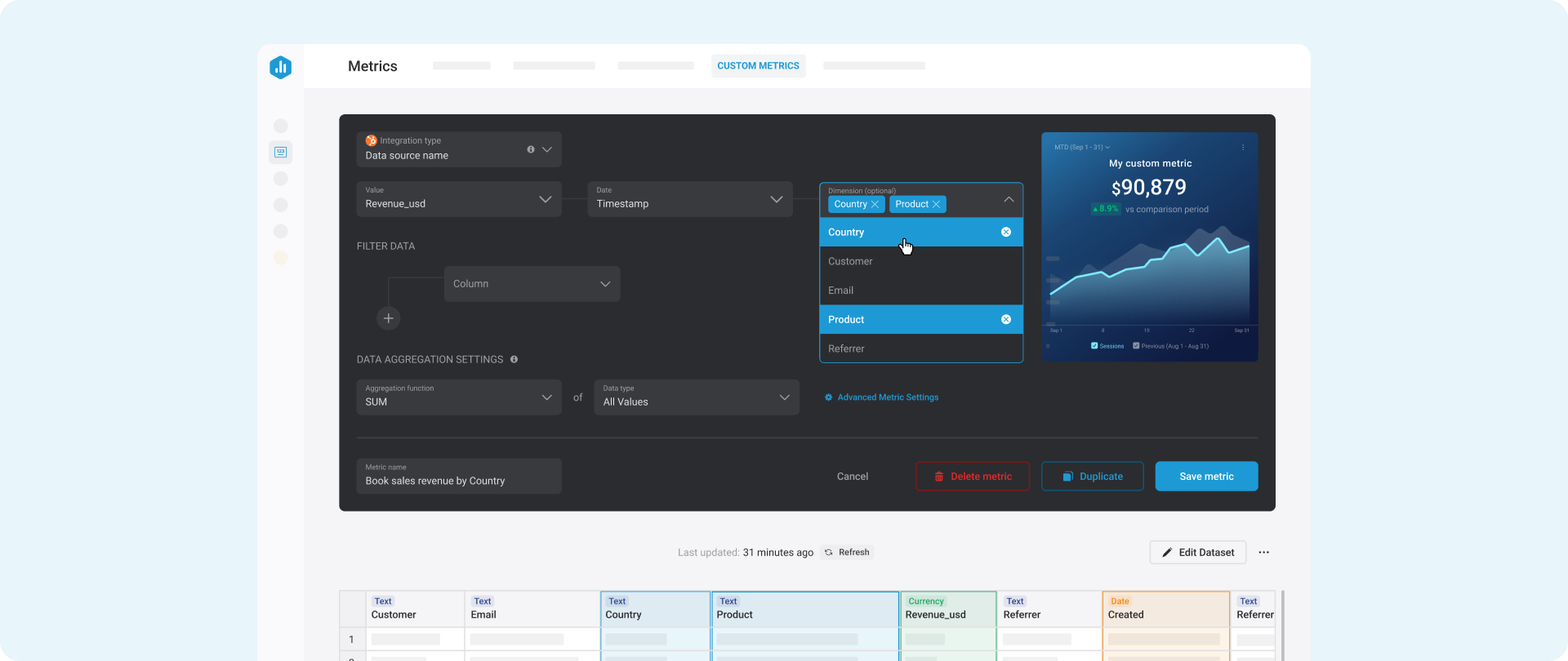 Create the custom metric you need once, then apply filters or segment it by all the dimensions you need. Available for datasets integrations, with more being added regularly.