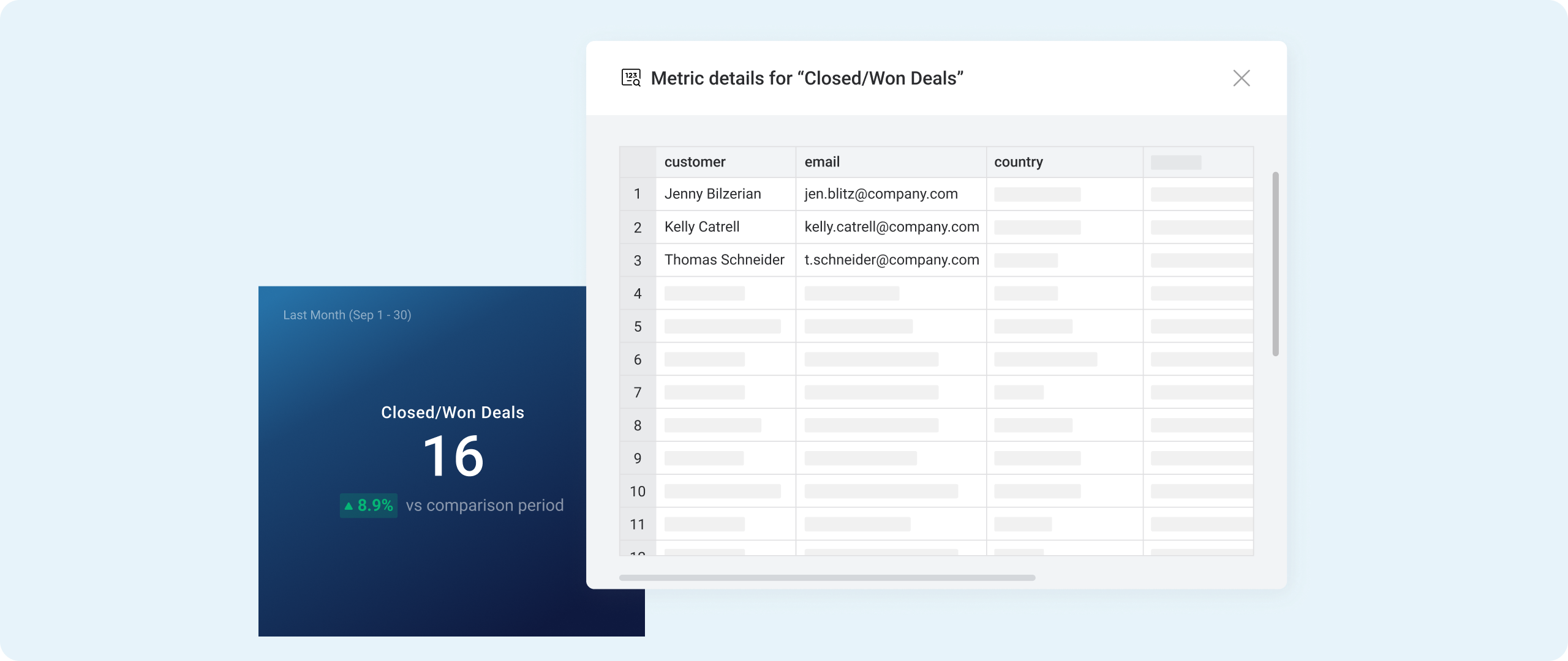 Click a metric on your dashboard to reveal the row-level data behind it.