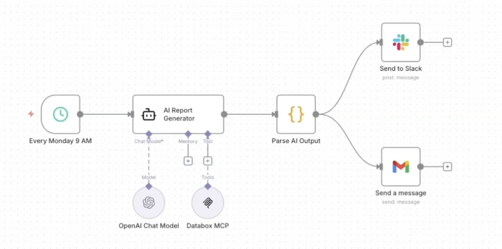 In this tutorial, we’ll build a fully automated reporting workflow using n8n, an AI agent, and Databox MCP. Every Monday at 9:00 AM, it will query your live metrics, calculate changes, and deliver a summary to Slack, plus a detailed report to email. No copying. No pasting. No spreadsheets.