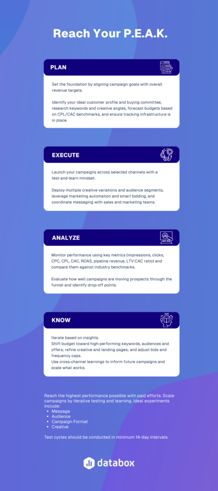 Plan starts with clarity. Teams define their ideal customer profile and buying committees, align paid goals to revenue targets, forecast budgets using realistic CAC and LTV assumptions, and ensure CRM and ad platforms are properly connected.