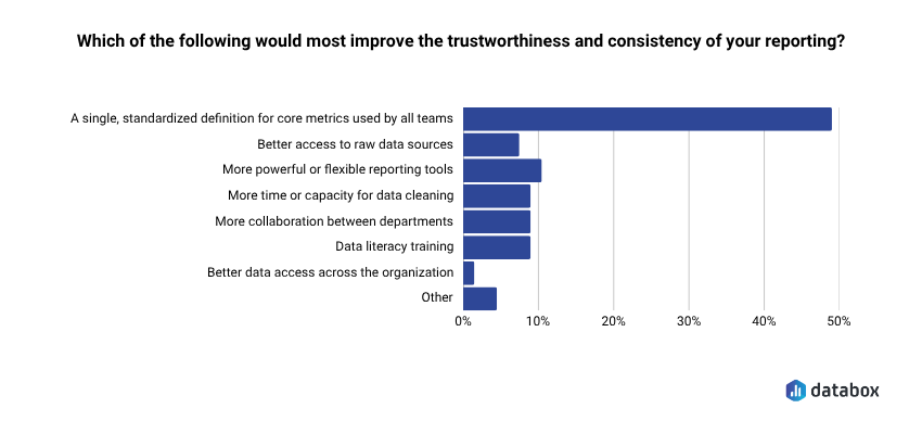 Databox’s Time to Insight survey found that 48.48% of respondents say a single standardized definition for core metrics would most improve the trustworthiness and consistency of their reporting. One shared definition eliminates a recurring source of meeting friction and restores time previously spent arguing over whose spreadsheet is correct.