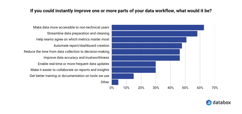Databox’s own research, Time to Insight, found that 62.12% of respondents say their top priority is making data more accessible to non-technical users, yet most organizations have not structurally solved for it.