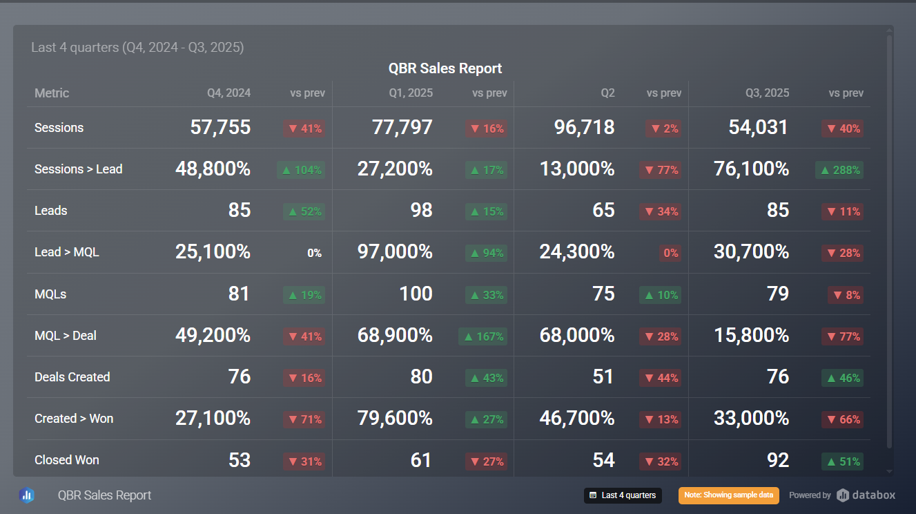 Cameron’s QBR report is powered by HubSpot CRM data, merged and enriched via Databox Datasets and Calculated Metrics. Here’s a simplified breakdown: