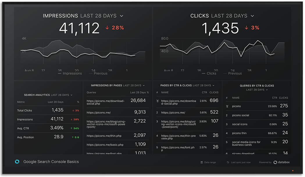 With Databox, your most important Google Search Console KPIs will be transformed into meaningful insights and delivered to your mobile, Apple Watch, TV display or Slack channels. One of the key benefits of Databox is the ability to combine multiple data sources in one place. This will help your team stay on top of the important metrics that drive your website traffic.