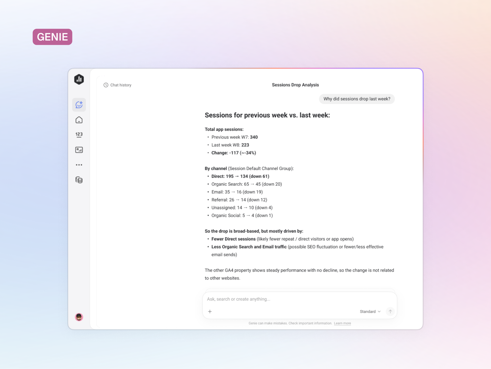 Ask Genie, your AI analyst, a question about your performance and get clear, visual answers instantly.