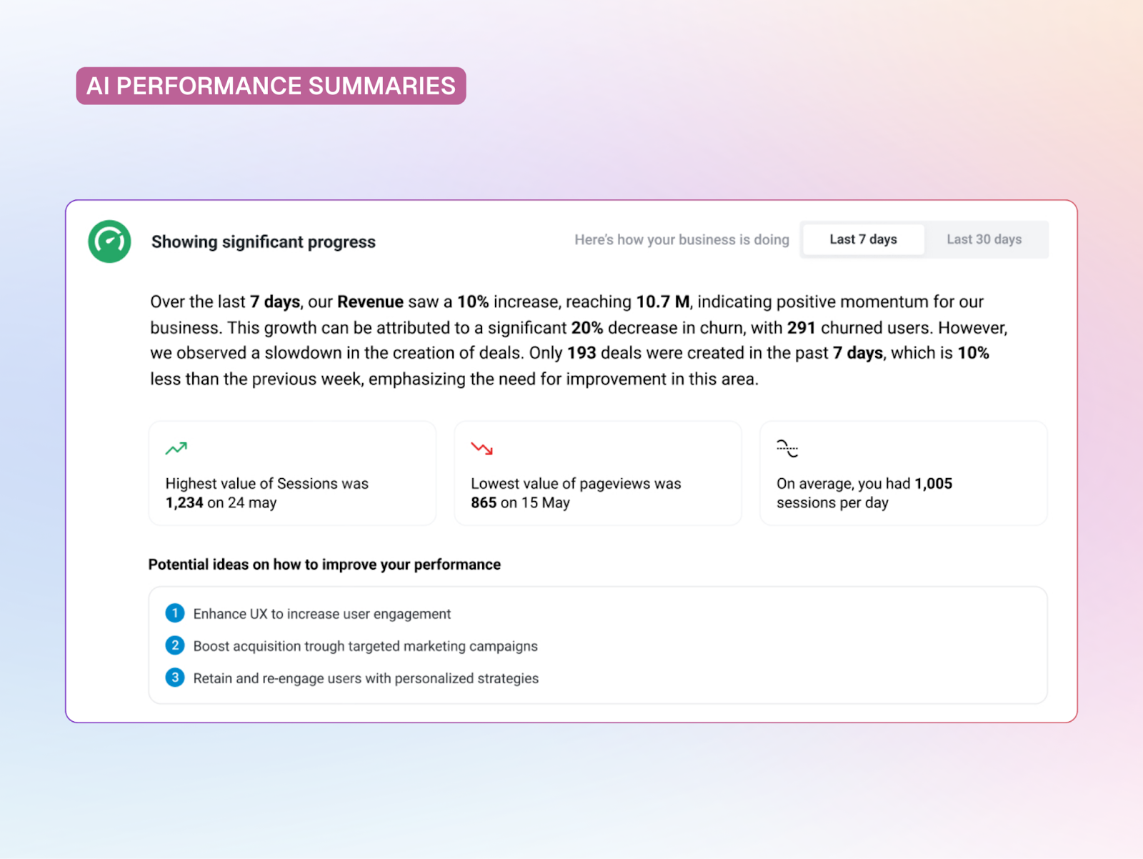 Metrics show you what happened. AI Performance Summaries explain why.