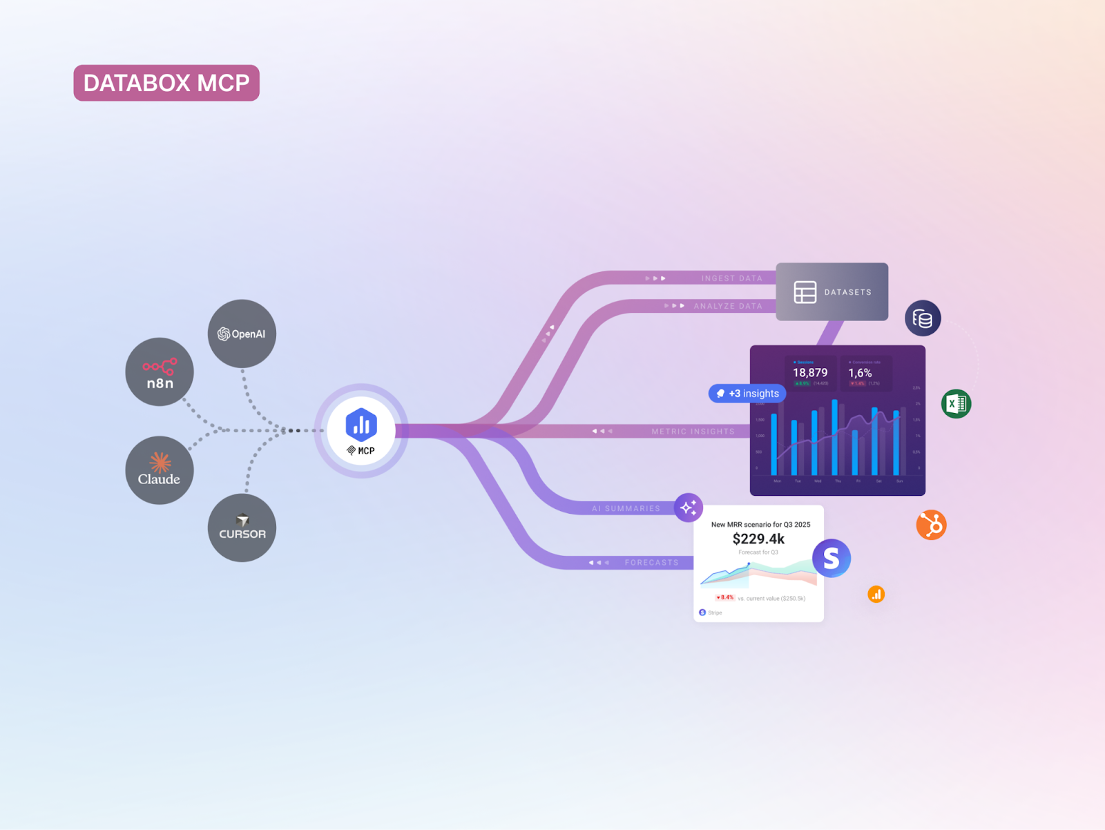 With Databox MCP, you can bring your performance data into AI tools your team already uses, like Claude, n8n, or ChatGPT. That means you can analyze performance and trigger workflows without opening a single dashboard.