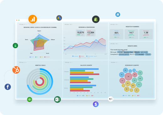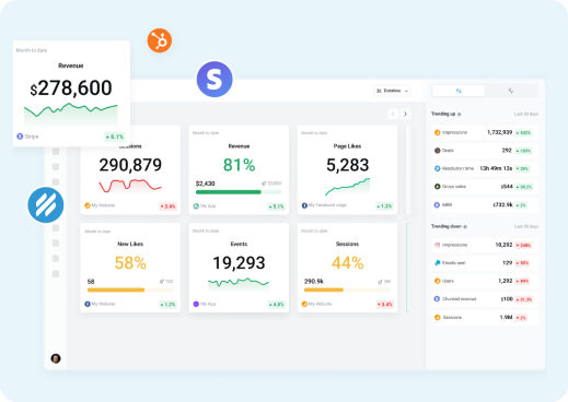 And if you need important metrics from a different data source, no worries. You can connect powerful software integrations, APIs, Databases and custom Spreadsheets.
