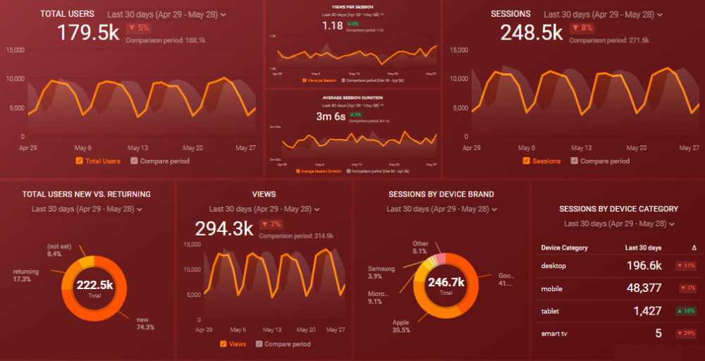 Now you can benefit from the experience of our Google Analytics experts, who have put together a plug-and-play Databox template that contains all the essential metrics for understanding how successful you are at attracting visitors from different channels. It’s simple to implement and start using as a standalone dashboard or in management reports, and best of all, it’s free!